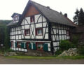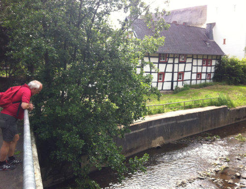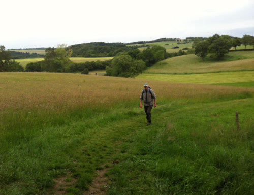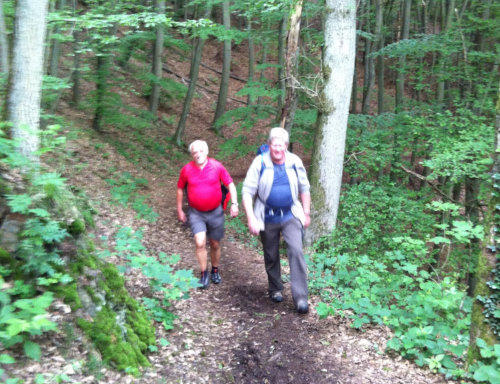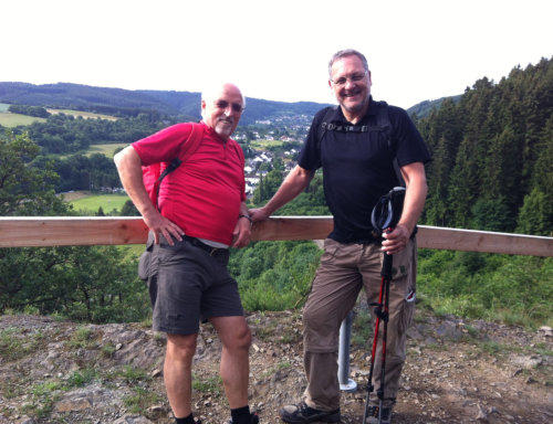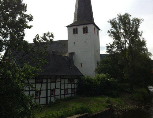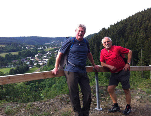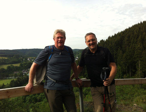 Nach einem ausgiebigen Frühstück starten wir früh am Morgen unsere 5. Etappe von Gemünd nach Kloster Steinfeld. Der Himmel ist bedeckt und der Wetterbericht hat für den Nachmittag Regen gemeldet. Das braucht eigentlich kein Mensch auf einer Wanderung. Gleich von Gemünd geht es recht steil den Berg hinauf, hinab und wieder hinauf zum Aussichtspunkt Kuckucksley. Hier sehen wir schon den nächsten Ort: Olef.In Olef, das scheinbar um diese Uhrzeit noch im „Sonntagsschlaf“ liegt, sehen wir die spätgotische Kirche und viele nette Fachwerkhäuser. Wegen der Wetteraussichten haben wir nicht viel Zeit. Unser “Eifel-Aborigines” (Rolf) treibt uns an. Wir müssen weiter.Durch das Selbachtal zur Kindshardt laufen wir durch Wälder und freie Flächen. Weiter geht es zum Ort Golbach. Schon unterwegs wird uns für eine kleine Rast die OASE empfohlen. Machen wir natürlich, allerdings auch nicht lange, denn der Blick in den Himmel verrät nichts Gutes. Durch das Kalbach-Tal geht es zum nächsten Ort: Steinfelderheister. Hier erwischt uns das erste kleinere Regenschauer. Schnell hört es aber wieder auf und es geht weiter Richtung Kloster Steinfeld. Noch ein paar steile Anstiege und wir haben das Etappenziel erreicht. In Kloster Steinfeld geht’s in die Klosterschänke und nach einem kleinen Imbiss steht das Taxi für den Rücktransport nach Gemünd bereit. Resümee: Zwei tolle Tage, eine schöne Strecke mit viel Landschaft. Aber wie auch schon in der 4. Etappe geschrieben: Die Ausschilderung könnte teilweise besser sein.